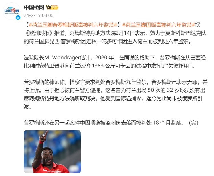 在今年2月,普罗梅斯上了全球各大体育媒体的头条。荷兰当地时间2月14日,阿姆斯特丹法院宣布,判处普罗梅斯6年监禁,罪名是他通过安特卫普港走私共计1.36吨的可卡因!然而,这并不是普罗梅斯唯一的法律麻烦。在2020年的一次家庭聚会中,普罗梅斯因为刺伤自己的表弟,又被判处18个月的监禁。