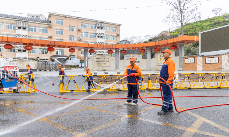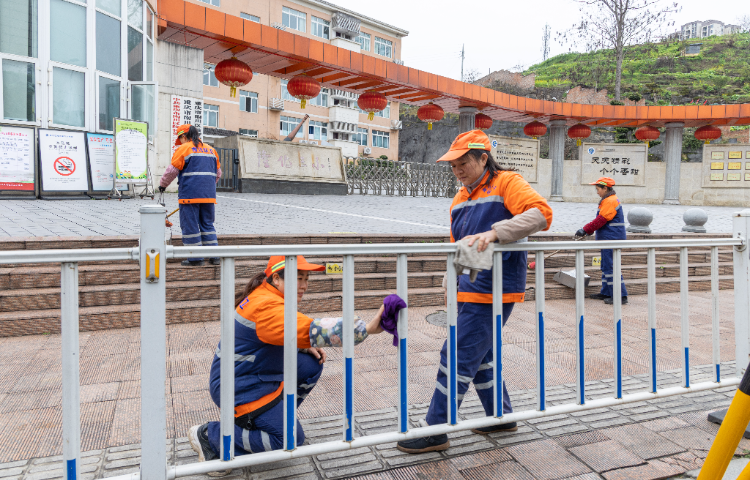 2月17日,城市管理局环卫清扫和冲洗保洁人员对隆化三校周边人行道、路面及隔离栏进行擦拭保洁。