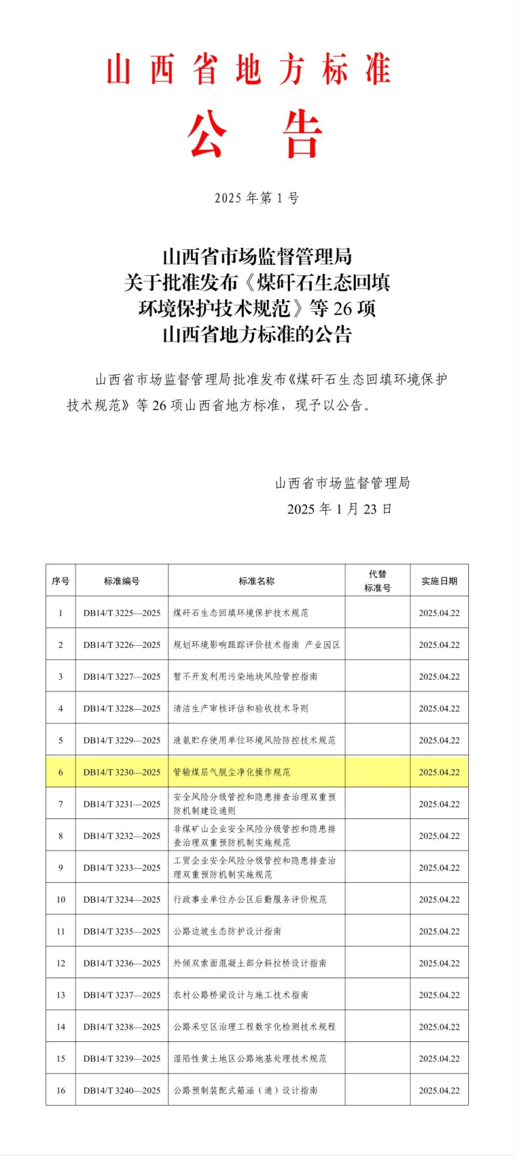 近日,由华新燃气集团主导制定的山西省地方标准《管输煤层气脱尘净化操作规范》(DB14/T 3230-2025),已由山西省市场监督管理局批准发布,并于2025年4月22日正式推行实施。