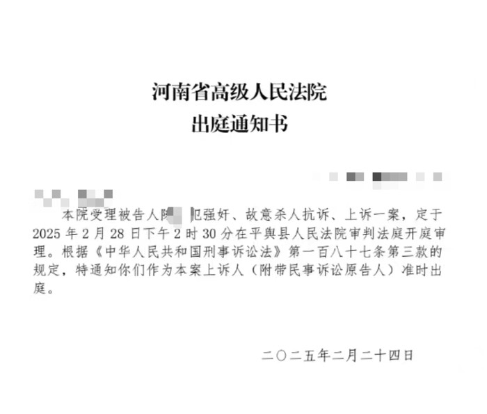 新黄河消息,26日晚,新黄河记者从小雨(化名)妈妈陈女士处获悉,河南省高级人民法院受理了被告人陈某犯强奸、故意杀人抗诉、上诉一案,并定于28日下午开庭。新黄河记者注意到,河南省驻马店市人民检察院在抗诉书提到,认为一审量刑畸轻,被告人陈某犯罪行为特别卑劣,主观恶性极大,应依法判处被告人死刑立即执行。