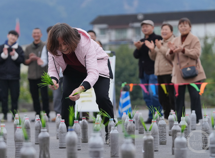 村民们在参加“趣味插秧”趣味活动。
