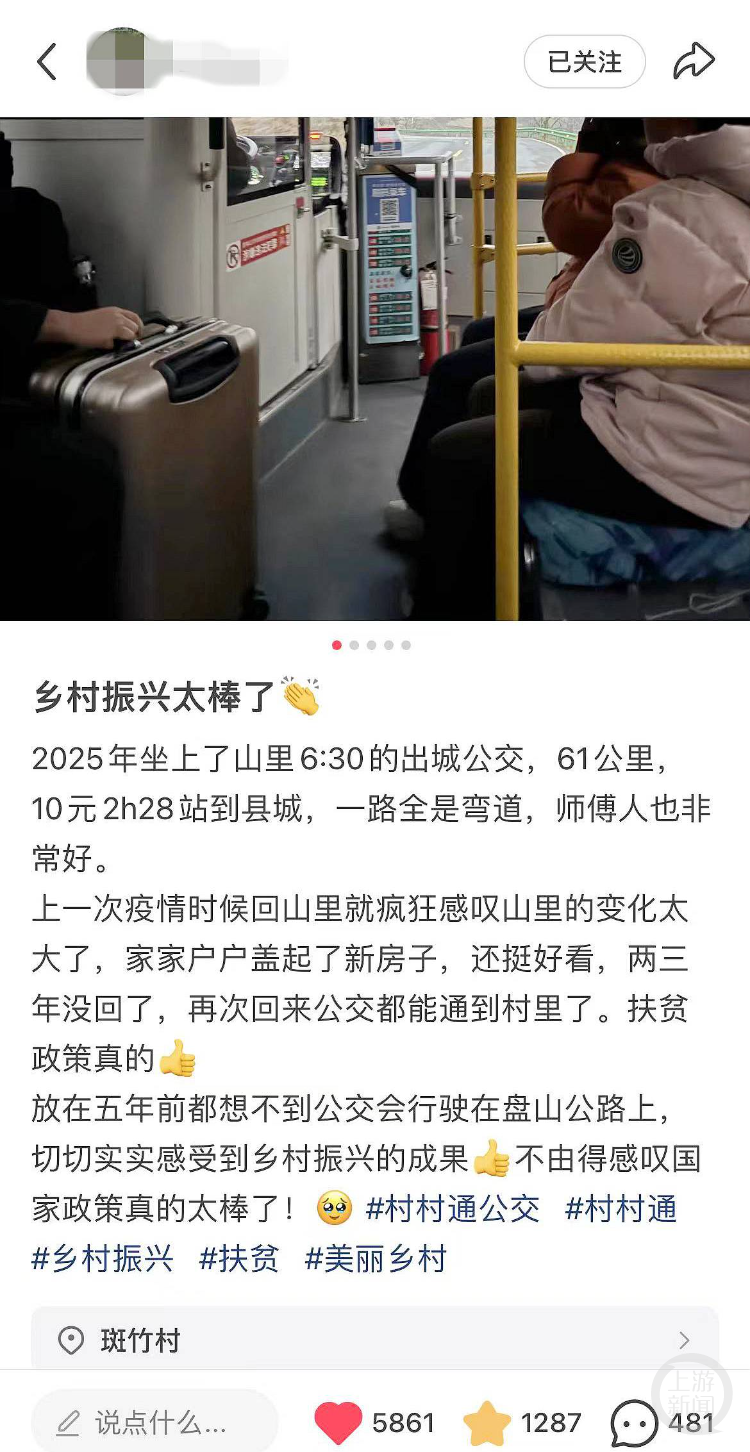 网上这个简单的乘坐公交车的故事,意外引起上千网友的回应与共鸣,大家积极分享着乡村振兴给自己身边带来的小小变化。在黄欢的帖子评论区,网友“你还记得吗”的一席话赢得最高点赞:“乡村振兴是什么?乡村振兴就是‘人’,是他们切实提升的生活质量。”