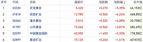 截至发稿,灵宝黄金(03330.HK)涨超5%,山东黄金(01787.HK)、招金矿业(01818.HK)双双涨逾4%,紫金矿业(02899.HK)等个股跟涨。