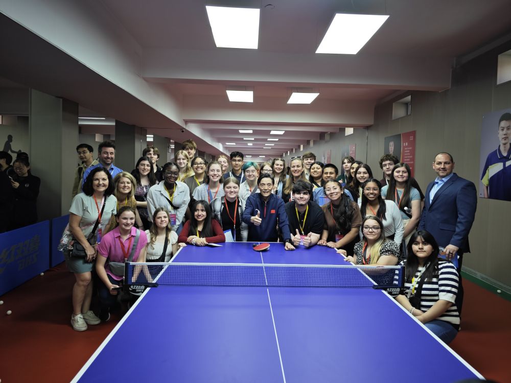 美国师生在石家庄外国语学校体验打乒乓球后与中方人员合影留念 白林 摄
