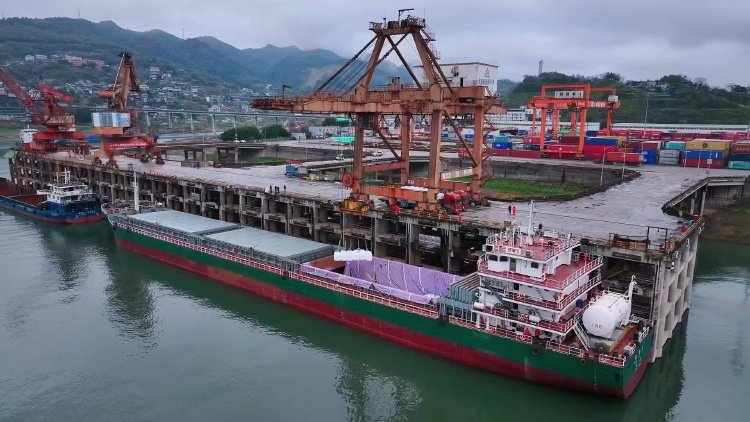 去年5月,“创新5”轮载着5400吨粮食,在重庆江津珞璜港顺利靠岸,完成了重庆—舟山“江海直达”航线“首秀”之旅。
