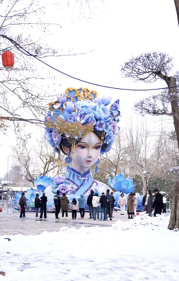 近日,山东济南突遭寒潮侵袭,气温骤降近20摄氏度,大明湖畔迎春花灯会仍在如火如荼地进行。3月6日,有游客在社交平台发布一段视频,显示大明湖畔的“夏雨荷”花灯因雪水浸染,脸上似乎浮现两团青色,宛如泪水冲刷后的“脱妆”效果。该视频引发热议,许多网友调侃:“果然是‘夏雨荷’,大雪一过,她哭花了妆”“‘夏雨荷’带泪,这下更像古典仕女了。”还有网友打趣道:“雪后的‘夏雨荷’少了一份精致感,却更添一份娇柔姿态。”