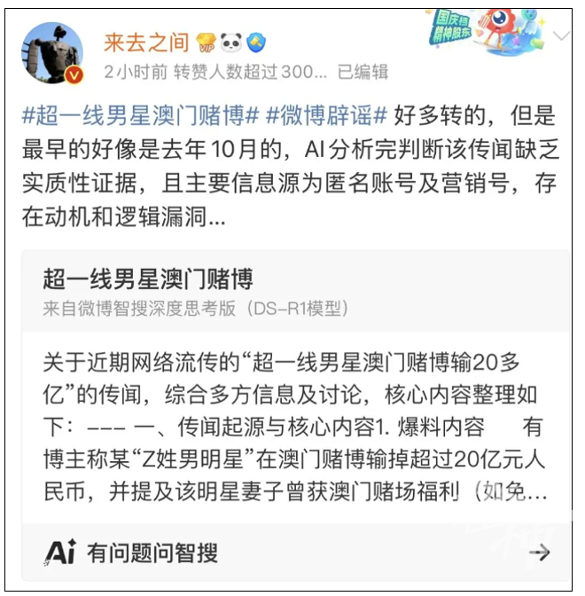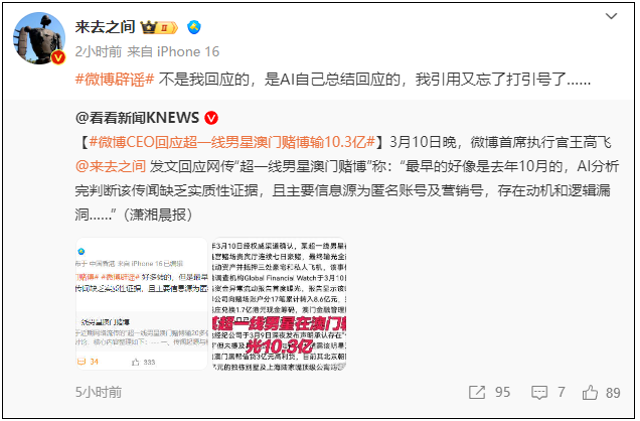 针对近日在微博等网络平台盛传的“超一线男星澳门赌博”爆料,3月10日晚,微博首席执行官王高飞带“微博辟谣”话题发博回应:“AI分析完判断该传闻缺乏实质性证据,且主要信息源为匿名账号及营销号,存在动机和逻辑漏洞……”