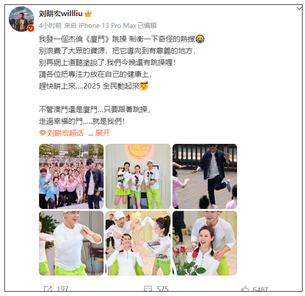 此外,刘畊宏也晒出周杰伦在厦门跳操照片,称:“制衡一下奇怪的热搜,别再网上道听途说了。”