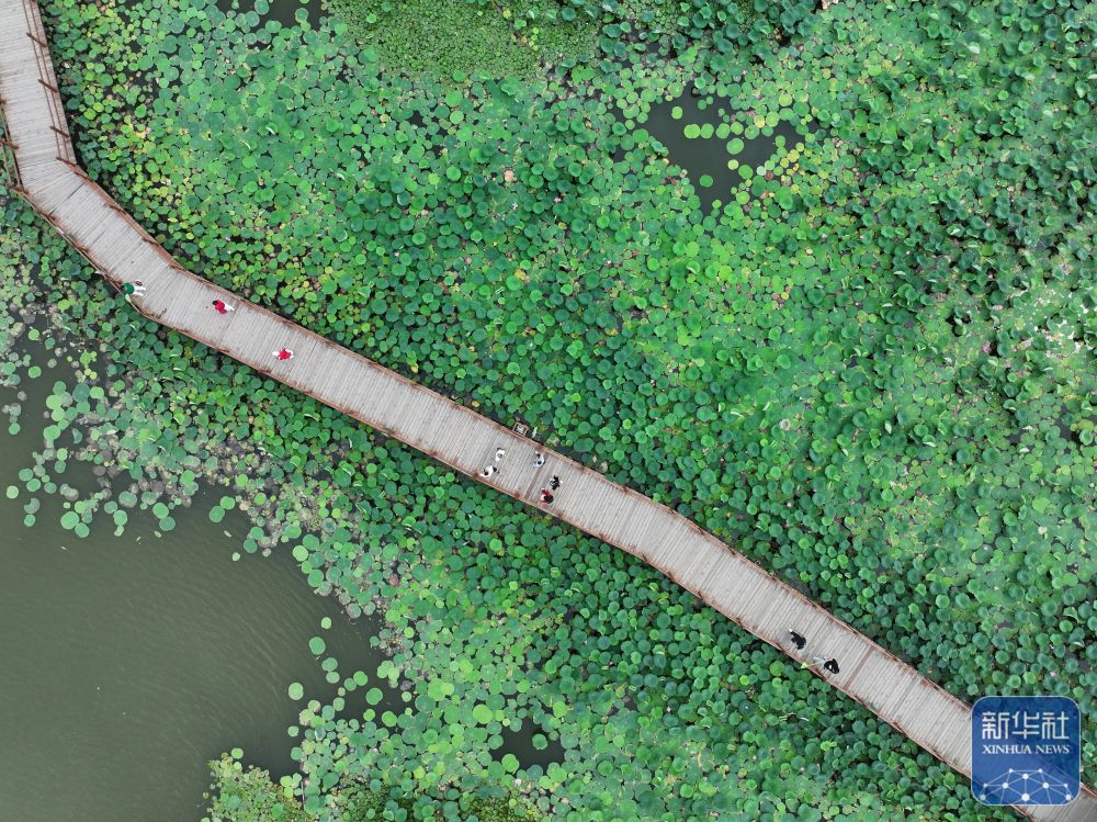 ↑游人在雄安新区白洋淀荷花大观园内游览(2024年7月9日摄,无人机照片)。
