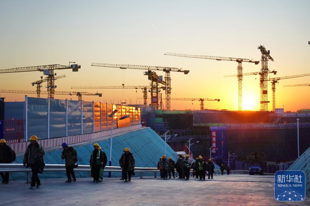 ↑落日余晖下的雄安新区国贸片区建设现场(1月15日摄)。