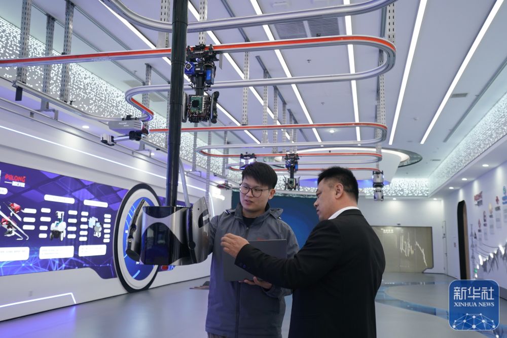 ↑在雄安新区科创中心中试基地,北京普龙科技有限公司工作人员在调试巡检机器人(2月26日摄)。