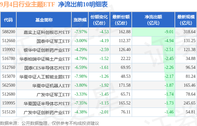 当日有177只行业主题ETF基金出现资金净流出,其中净流出排首位的是嘉实上证科创板芯片ETF(588200),份额减少了4.53亿份,净流出额为9.01亿元。