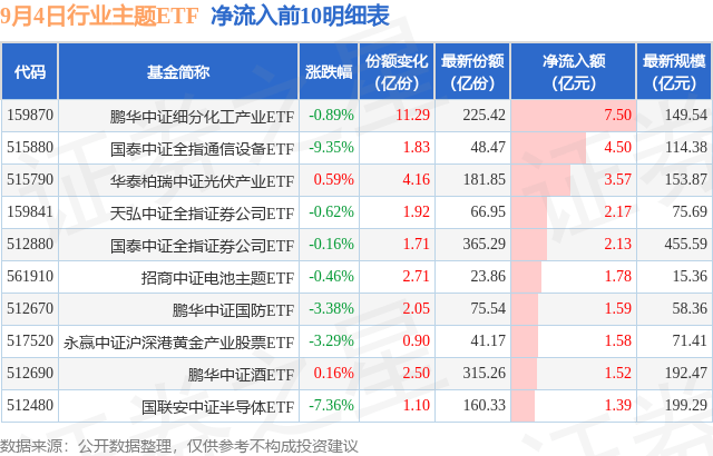 当日有94只行业主题ETF基金出现资金净流入,其中净流入排首位的是鹏华中证细分化工产业ETF(159870),份额增加了11.29亿份,净流入额为7.5亿元。