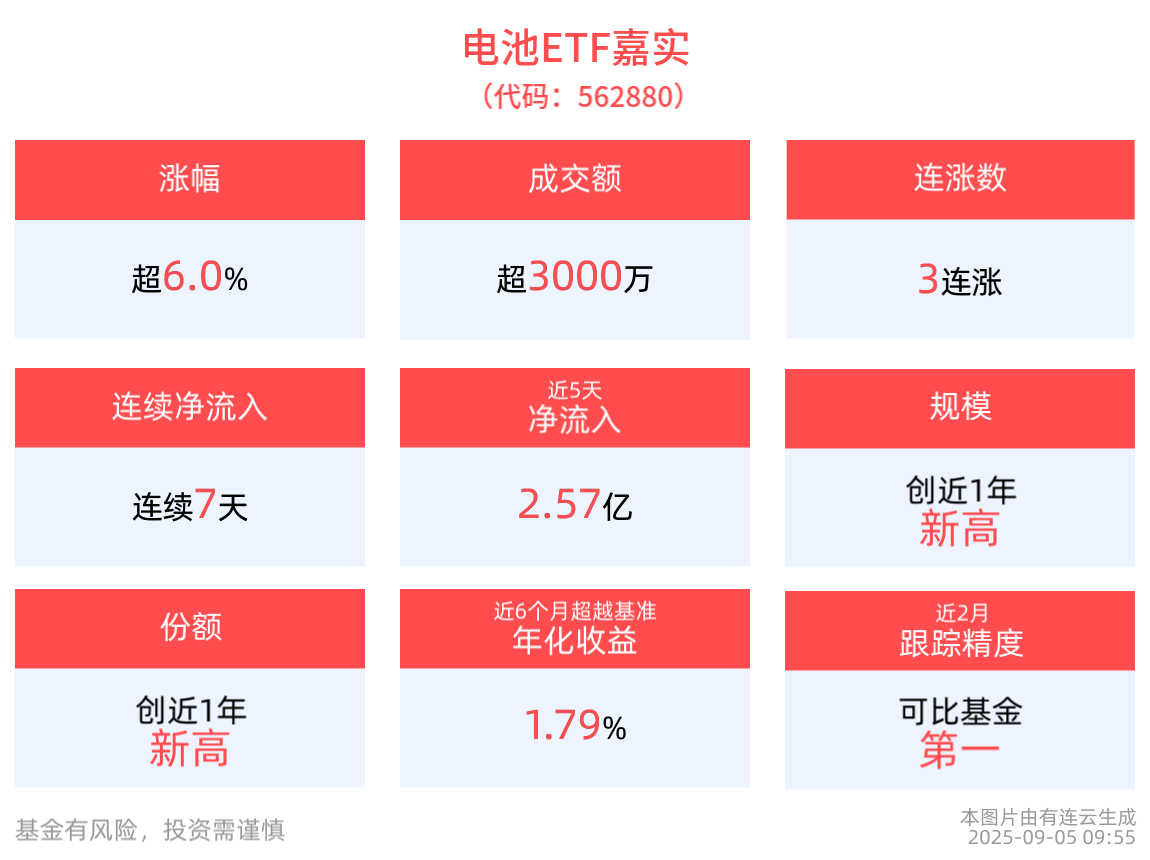 流动性方面,电池ETF嘉实盘中换手5.98%,成交3973.73万元。拉长时间看,截至9月4日,电池ETF嘉实近1周日均成交6207.90万元。