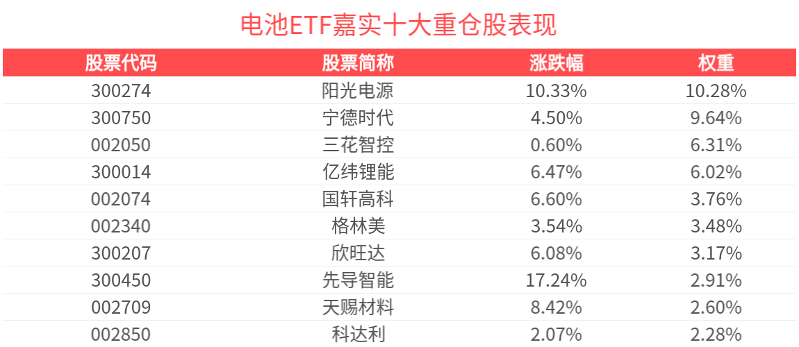 数据显示,截至2025年8月29日,中证电池主题指数前十大权重股分别为阳光电源、宁德时代、三花智控、亿纬锂能、国轩高科、先导智能、格林美、欣旺达、银轮股份、天赐材料,前十大权重股合计占比53.03%。