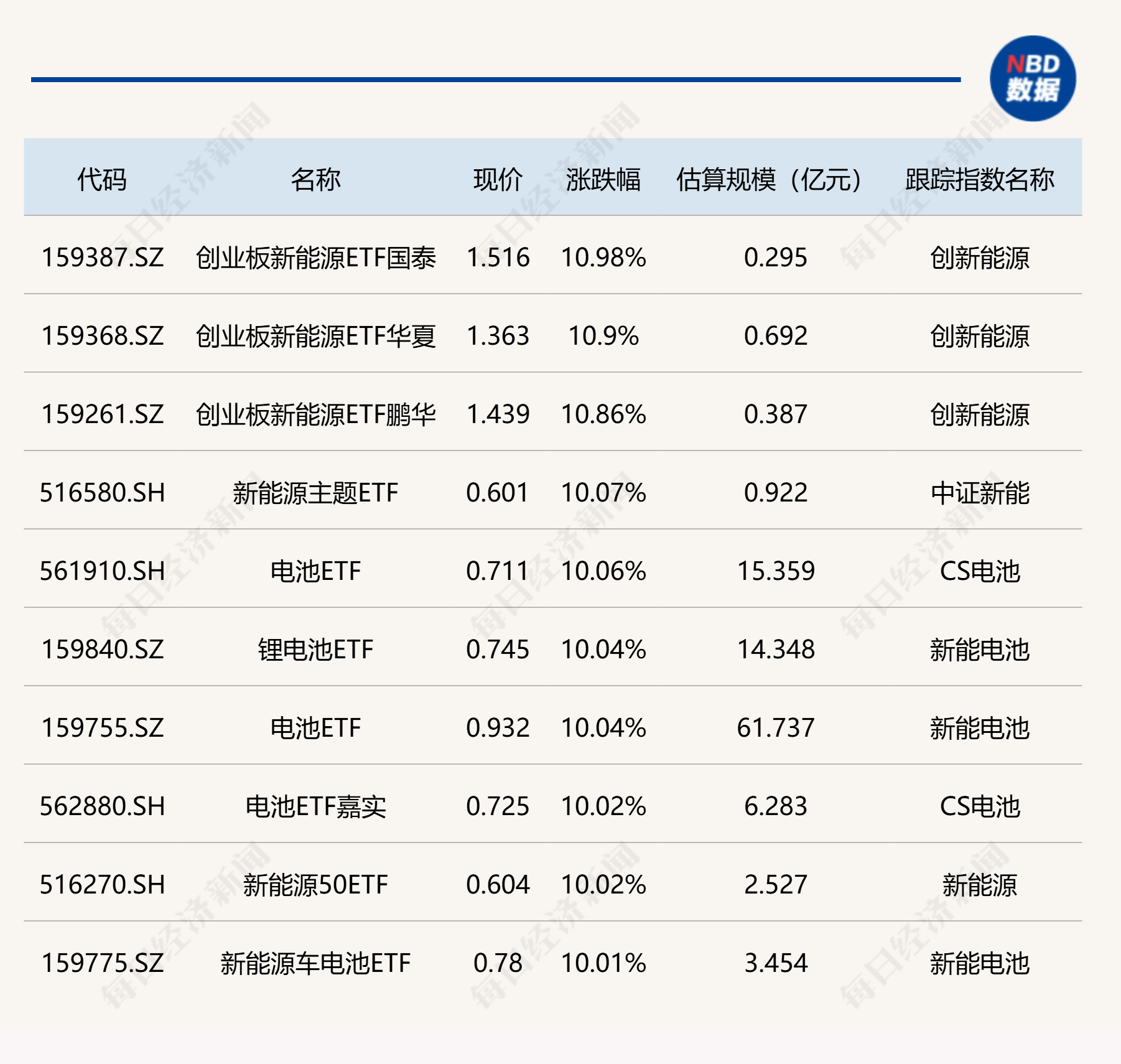 ETF上涨方面,多只新能源、电池相关ETF涨约10%。
