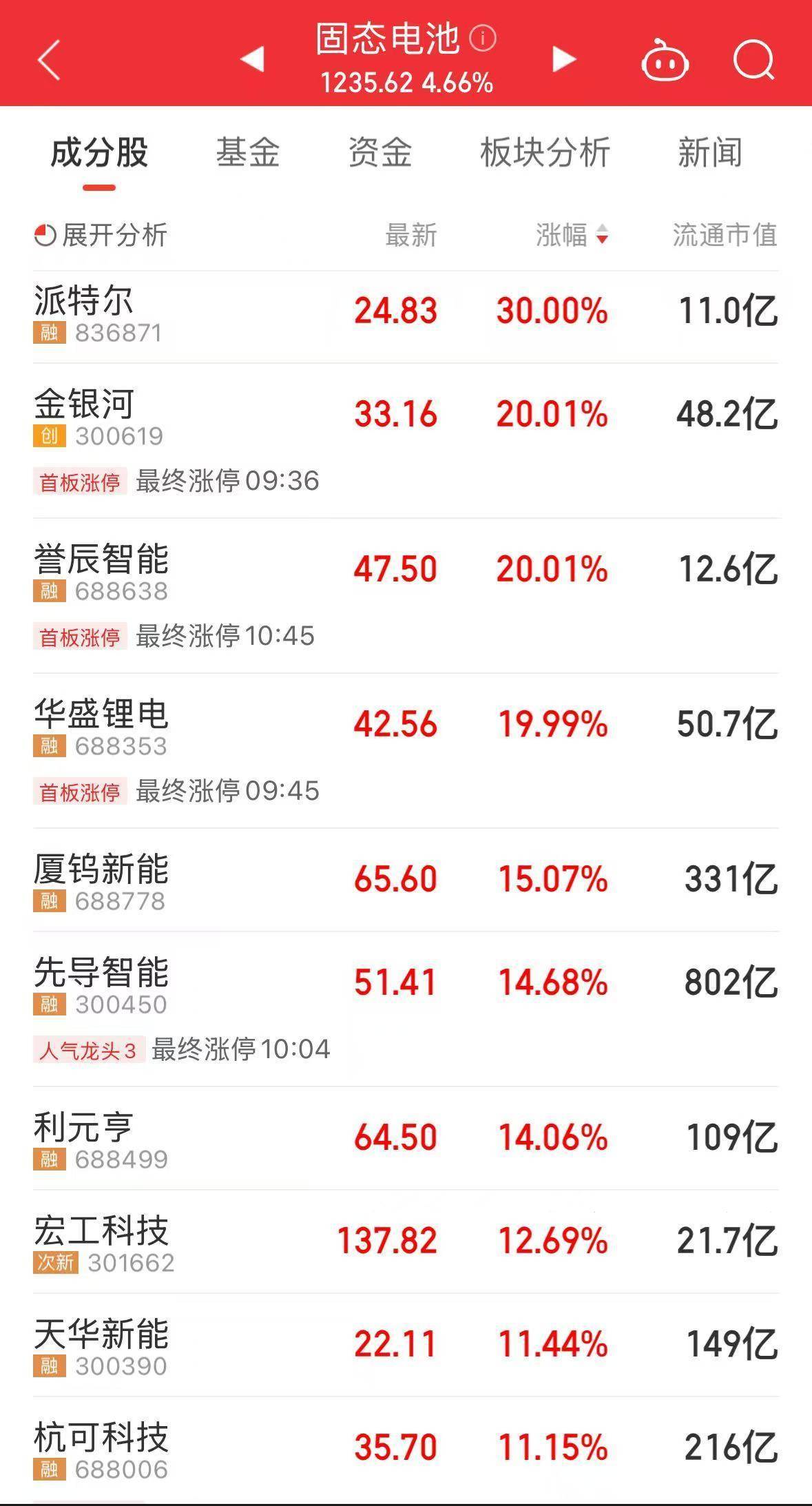 固态电池概念股集体走高,派特尔涨30%,金银河开盘1分钟即实现20%涨停,先导智能、誉辰智能、华盛智能纷纷涨停。