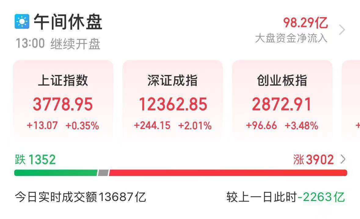 截至收盘,沪指涨0.35%,深成指涨2.01%,创业板指涨3.48%。