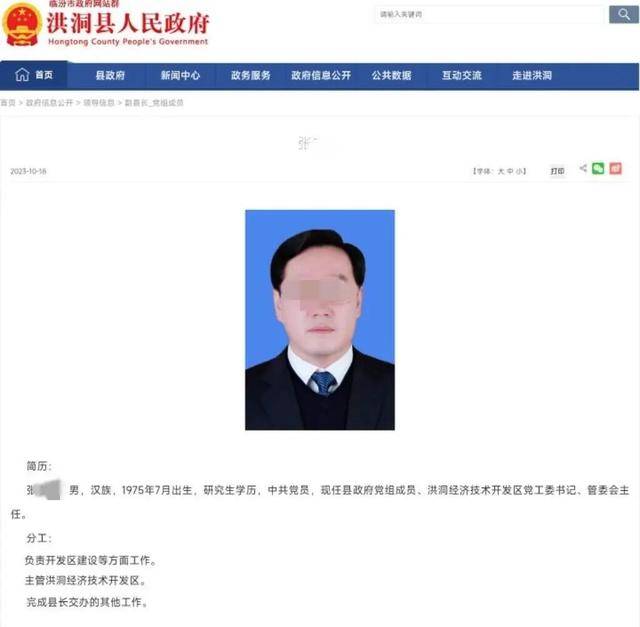 数日前,极目新闻记者已关注此事。此前,记者从洪洞县政府办获悉,截至8月中旬,张某某不主持开发区管委会工作已有多日,并配合调查。9月5日,记者发现,洪洞县政府官网上张某某的简历已被撤下,其多篇招商考察、本地调研的报道被删除。