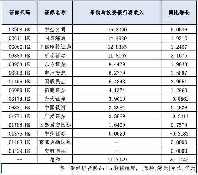第一财经据choice梳理,目前在港上市的13家券商(已披露业绩),2025年上半年的承销与投资银行费用收入合计91.7亿港元,较去年同期的70.6亿港元有明显提升。