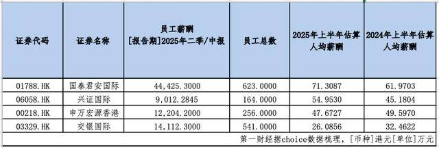 尽管多数券商未公开披露在港业务人员的具体薪酬情况,但根据第一财经基于Choice数据及2025年中期报告进行的估算(注:若未公布最新员工总数,则采用去年末数据),部分在港拆分上市中资券商人均薪酬呈现明显波动。