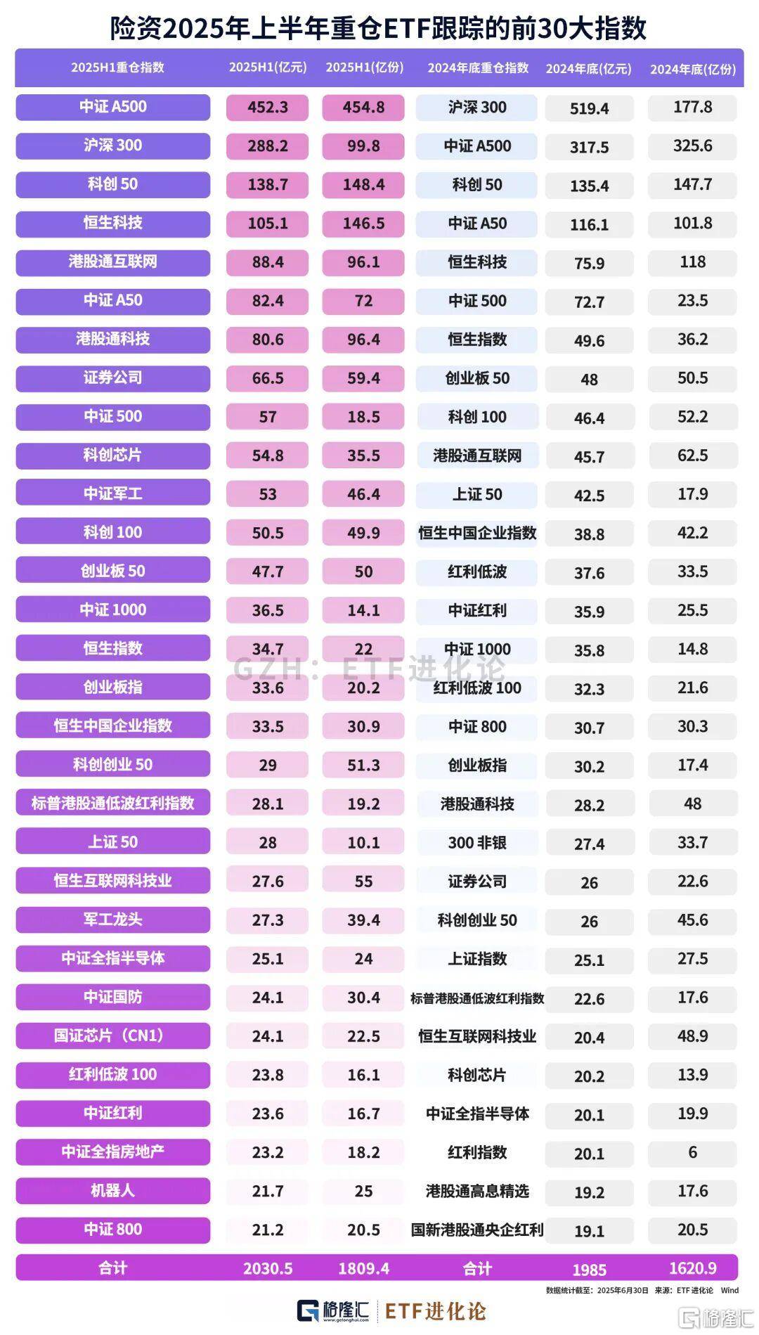 以重仓ETF跟踪指数统计,上半年合计布局了229种指数,其中前30只大指数合计规模2030亿元,占比超75%,是险资重仓方向。