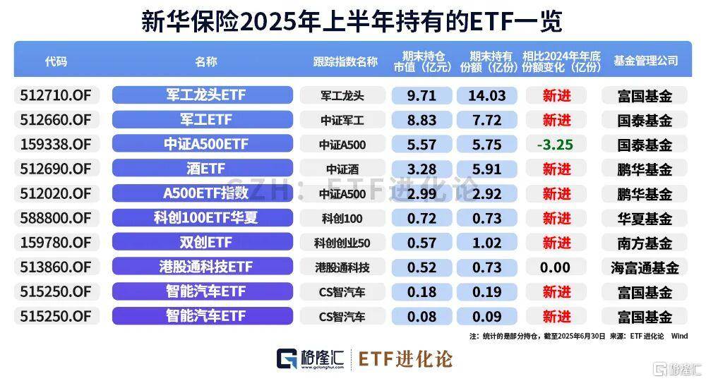 新华人寿保险股份有限公司上半年出现在93只ETF前十大持有人中,其中第一大持有人的ETF有17只,即今年上半年新进的9只ETF,其中7只分别是: