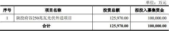 陕西水电原拟募集资金100,000.00万元,全部用于陕投府谷250兆瓦光伏外送项目。