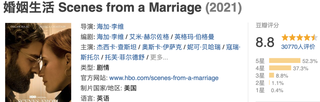 两位主演奥斯卡·伊萨克和杰西卡·查斯坦的表演极具张力,整部剧对婚姻的解剖,真实到让人窒息。