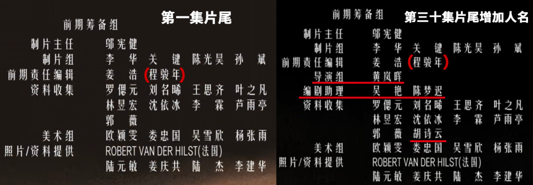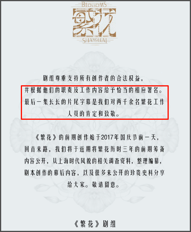 《繁花》声明中称,最后一集片尾字幕是对所有工作人员的感谢,结果网友对比发现,和第一集对比,片尾最后还增加了4个人名,其中有2名编剧助理。