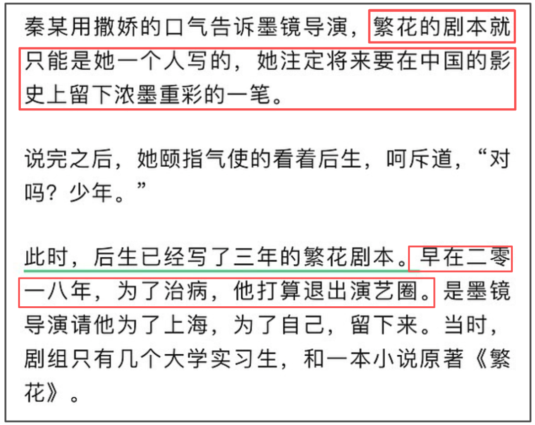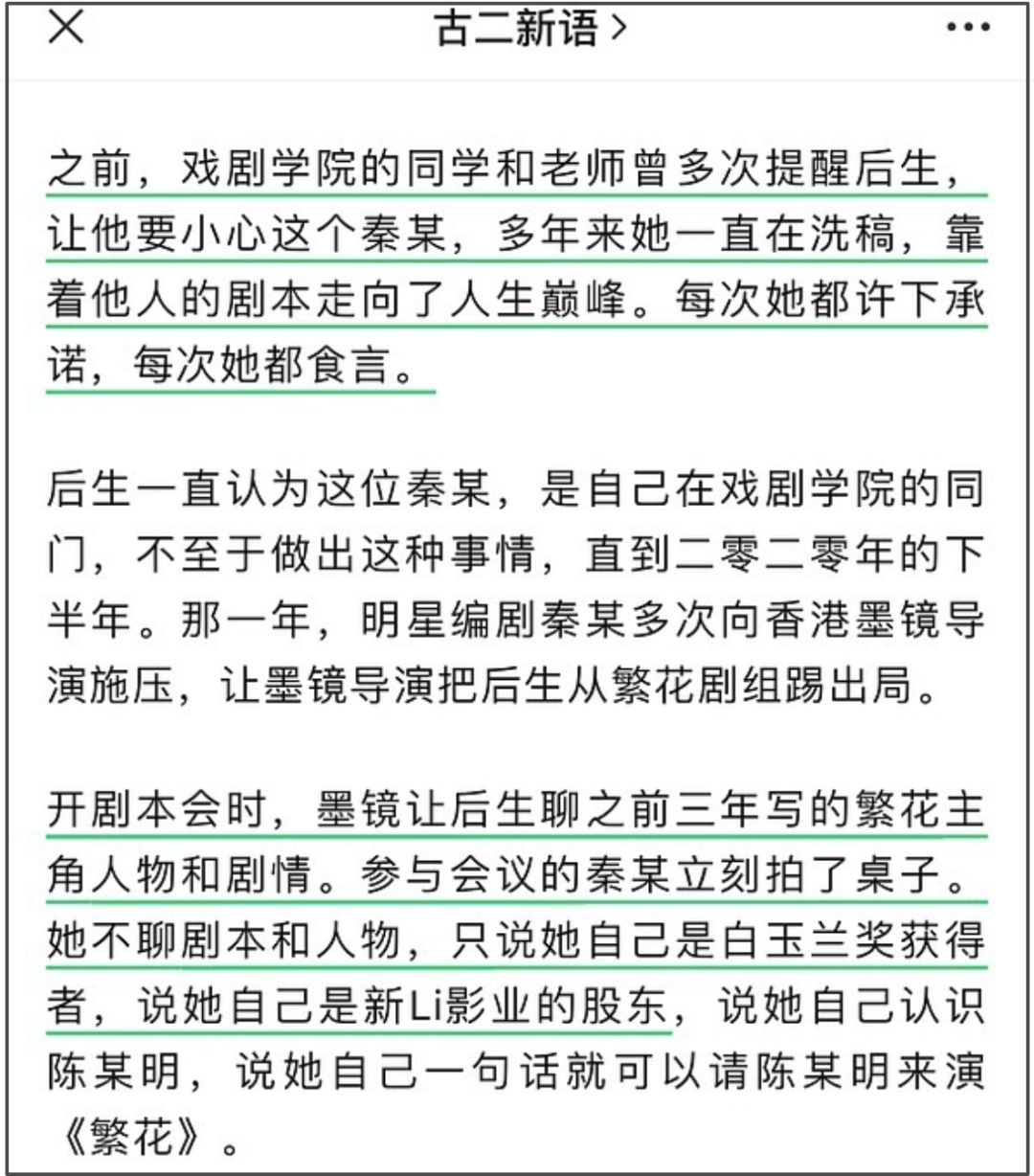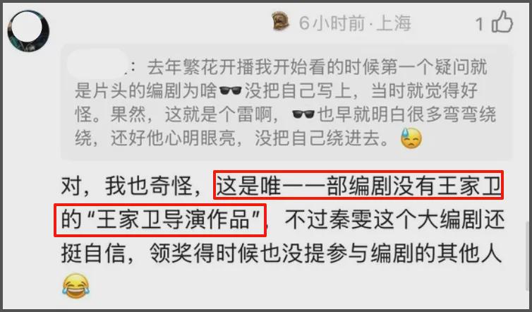 而据古二爆料,疑似秦雯早就和王家卫商量好,“《繁花》剧本只能是她一个人写的”,她要在中国影史上留下浓墨重彩的一笔,后来果然秦雯凭借编剧拿奖,获奖感言都没提其他参与创作的伙伴,仿佛这个剧本真的是她一个人一个字一个句写出来的一样。