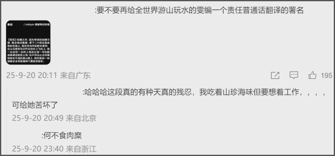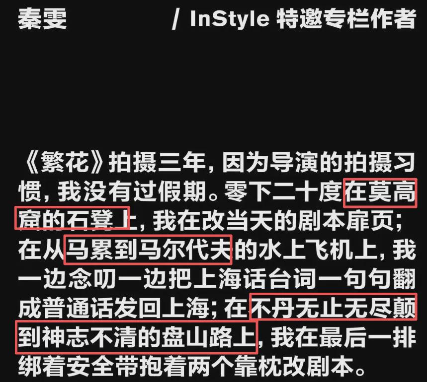 秦雯访谈时提到《繁花》剧本创作也不忘“卖惨”,仿佛无时无刻不在写剧本,在莫高窟、在马尔代夫、在不丹……在同行业编剧还在剧组跟组熬夜改细节的时候,秦雯已经可以在王家卫的剧组里旅行办公了,这何尝不是一种影视圈乱象?