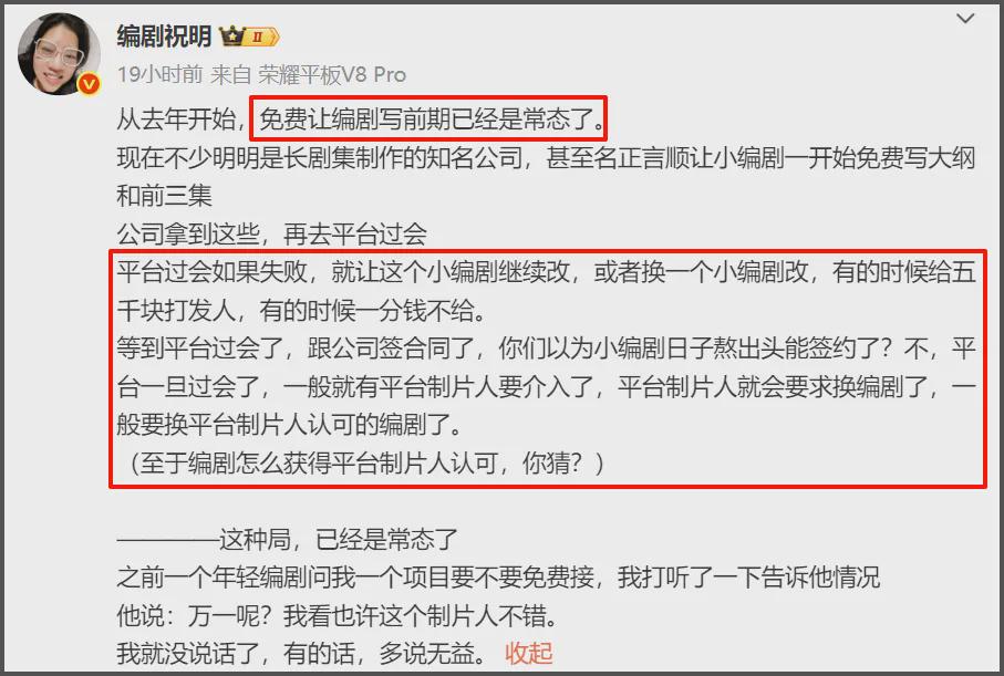 而业内爆料也印证编剧行业确实存在乱象,小编剧前期甚至要免费写稿,等到删删改改过会了,平台制片人介入了,就要换编剧了。有人脉有背景的大编剧高高在上,独享荣耀,小编剧也只能熬资历,挣扎求生,甚至连应有署名权都要不到,维权艰难。