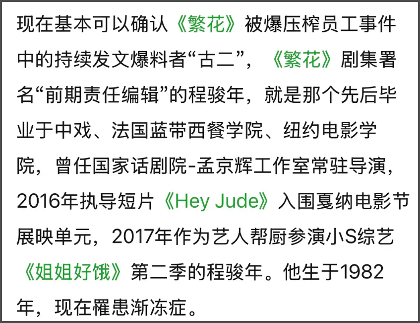 那么按照常理来说,古二就算不是唯一编剧,但也应该是编剧之一,但从网友扒出的古二信息来看,最终剧方只是给了“古二(程骏年)”一个前期责任编辑的署名。