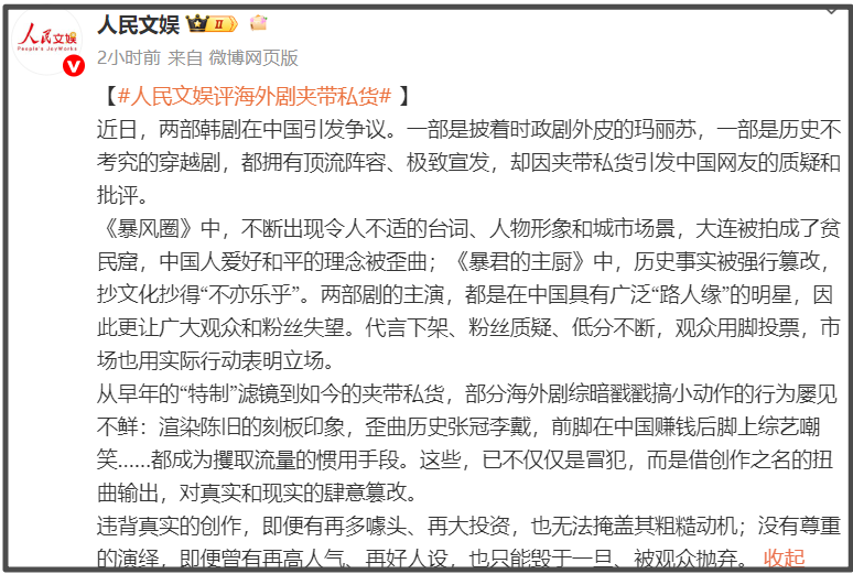 这里建议某些哈韩族不要再强行给韩星洗白了,好好看看人民文娱是如何批评这帮夹带私货的韩剧吧。