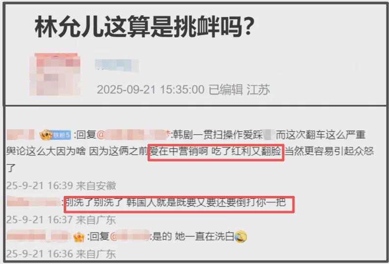 联想到网友一发全智贤黑历史就被锁帖,韩娱在中国的营销可谓无孔不入,时刻关注中国平台舆论,结果官媒一点名批评,林允儿就发社媒喊话,吃了红利又翻脸,还不算挑衅吗?