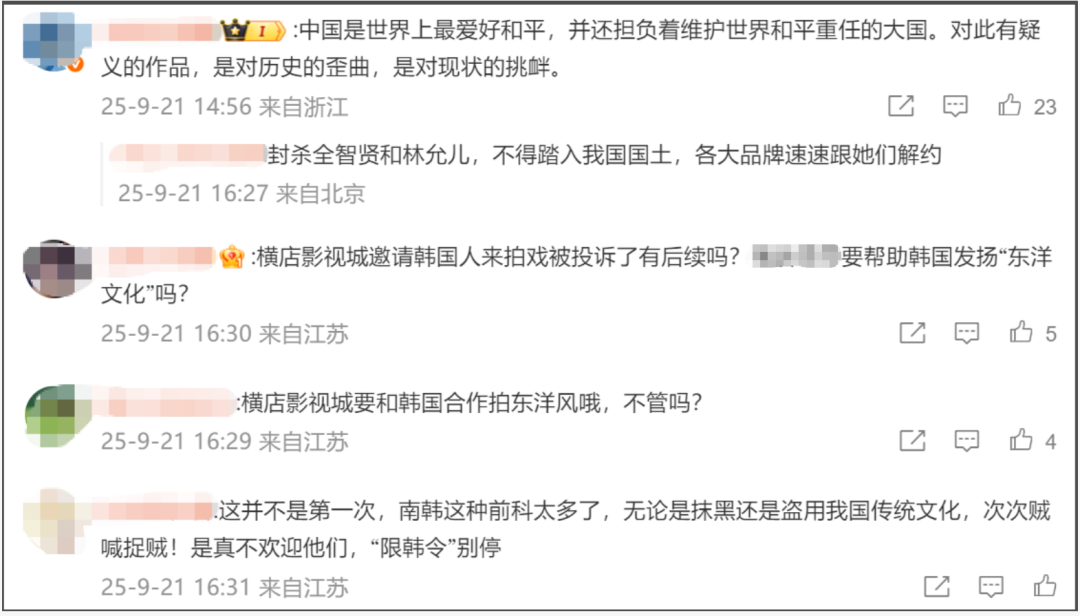 还有网友指出,全智贤、林允儿和他们背后的韩剧幕后主创,乃至海外播出平台,或多或少都涉及文化入侵,有一种借着影视作品进行渗透的感觉。