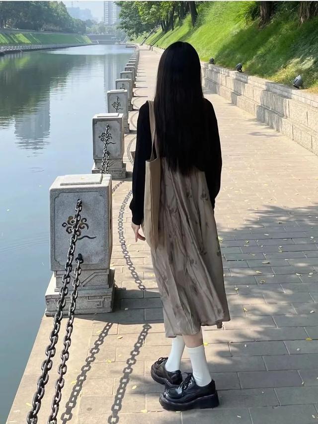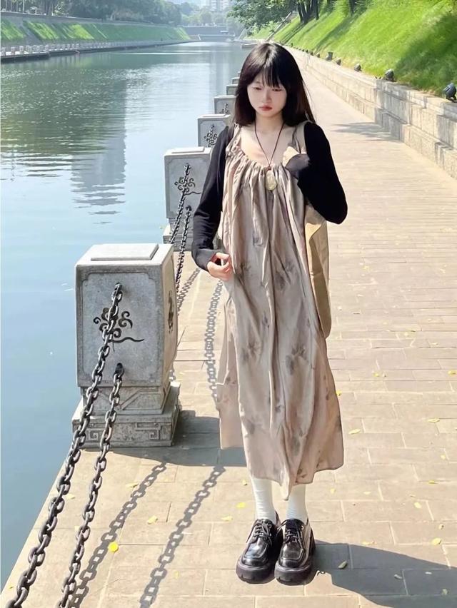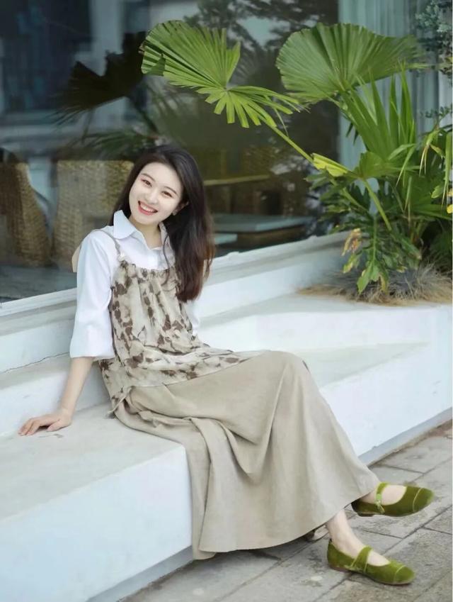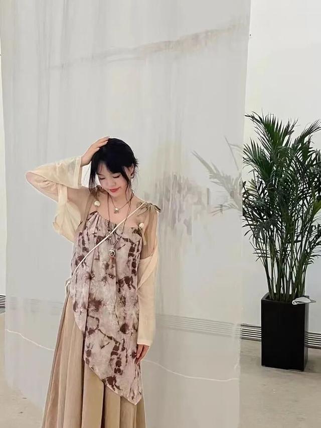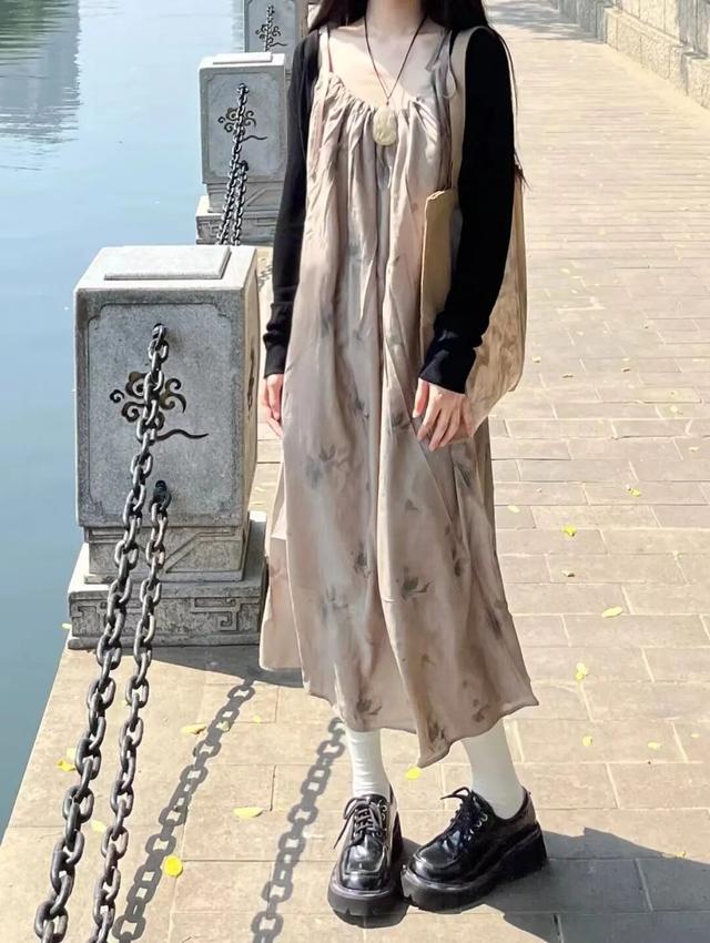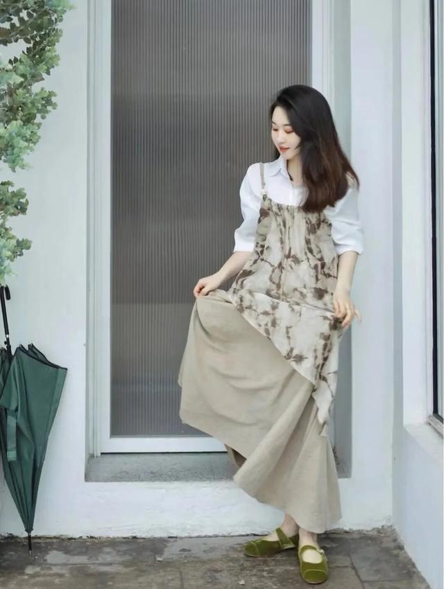 如果腰不细、肚子有肉肉的苹果型身材建议穿这种露脚踝的吊带连衣裙,裙子面料柔软有纹理感,看着很有韵味。