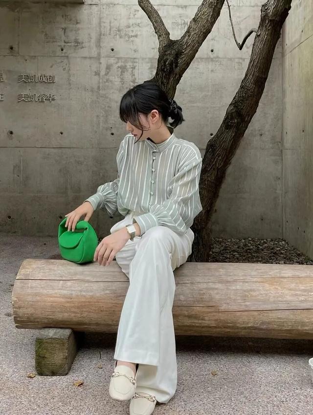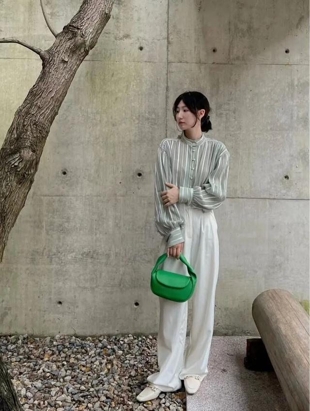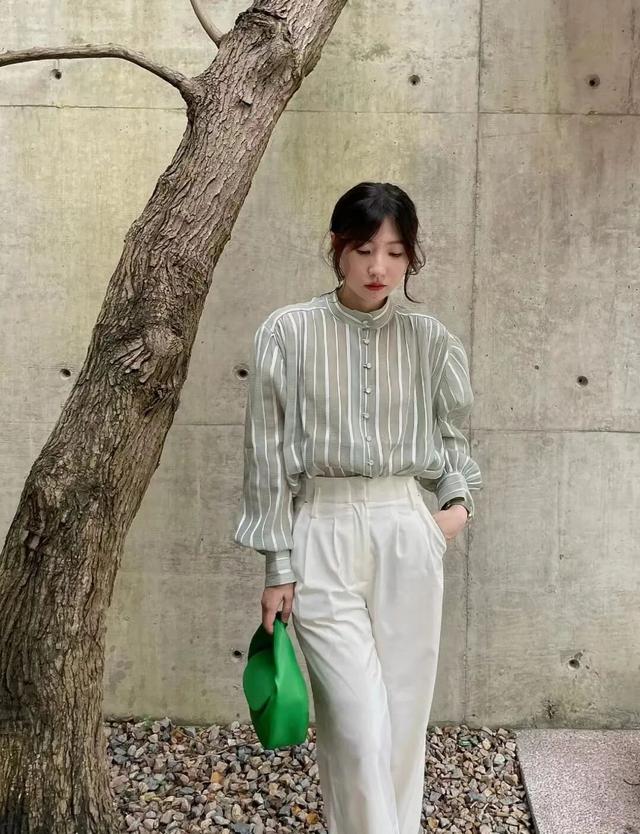 像上班族就可以好好利用豆绿色竖条纹衬衫+白色阔腿西装裤穿出好气质。