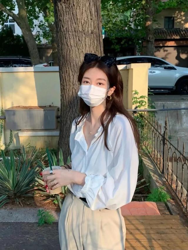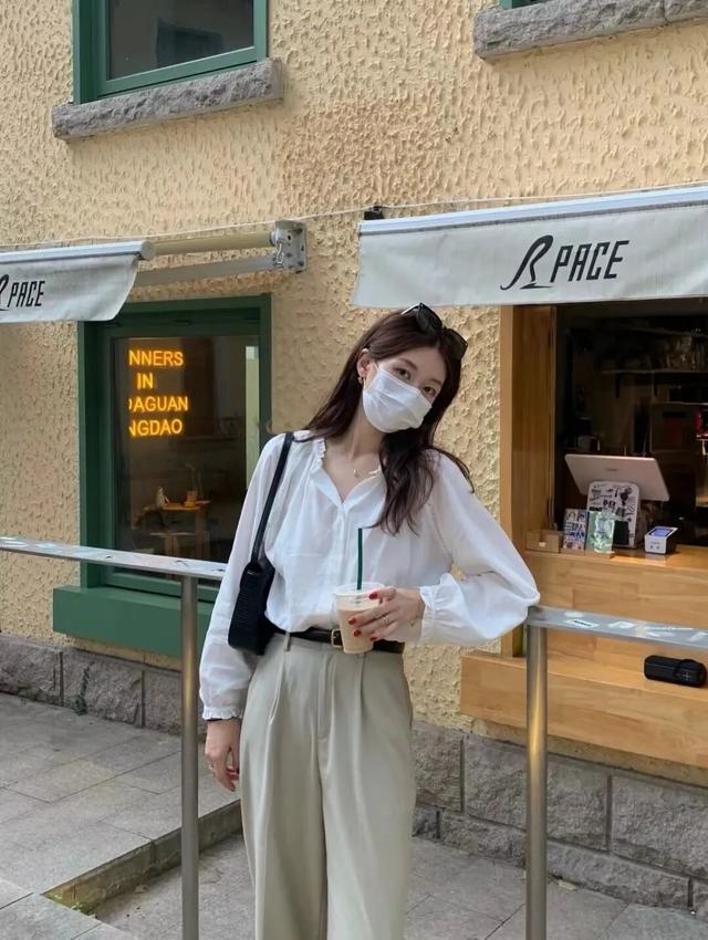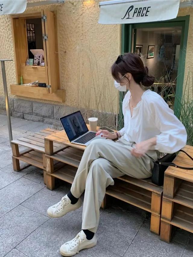 白衬衫搭任何颜色的裤子都很适合,上班通勤我更偏向于同色系穿搭,这样搭小白鞋也不违和,比如杏色就很不错,看起来很有质感。