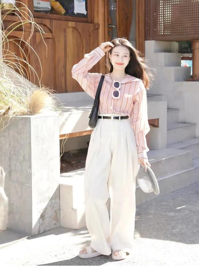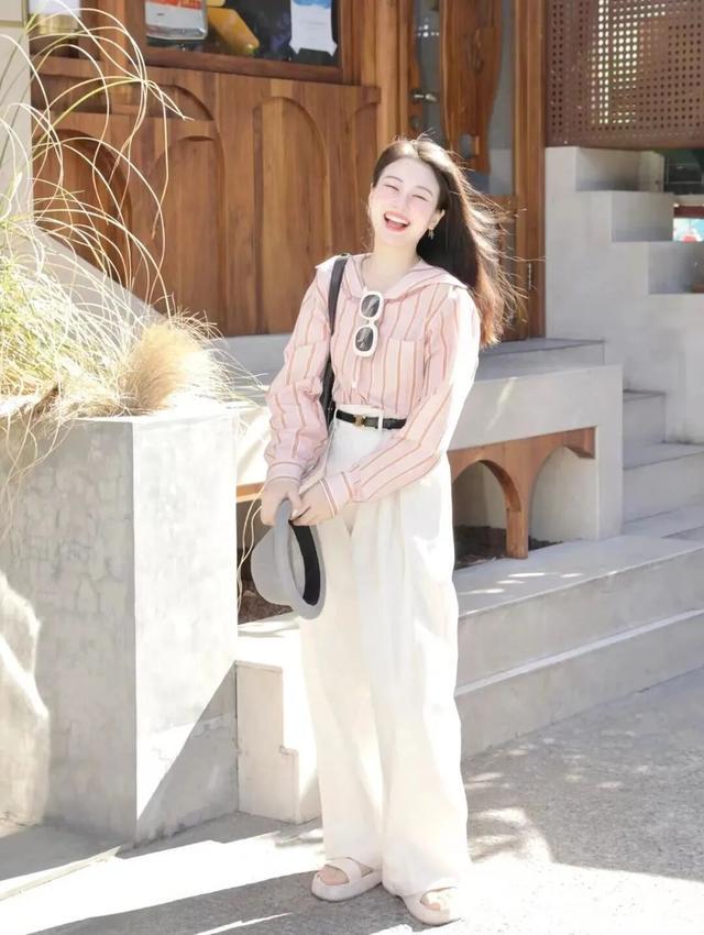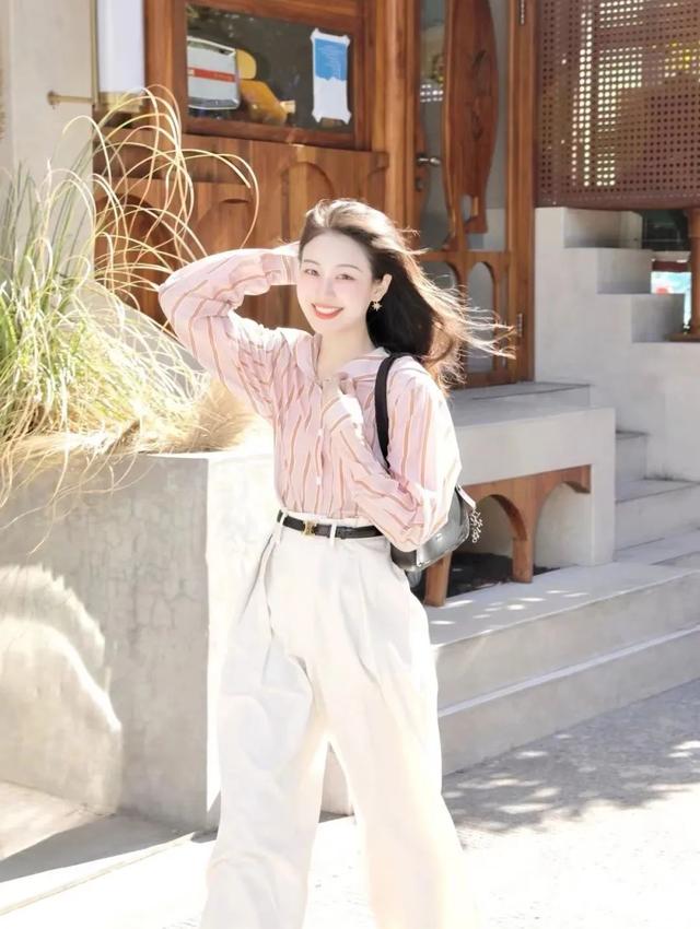 除了长裙,白色裤子也是塑造干练简约的好帮手,不想整体太素,可以选粉色条纹衬衫。