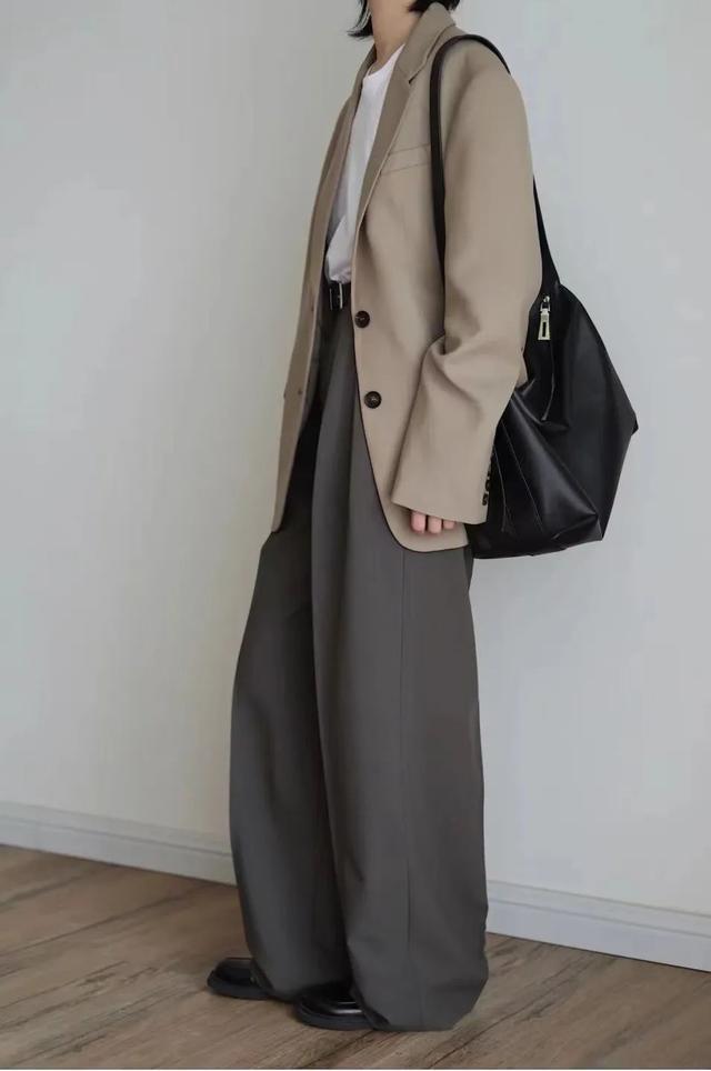 想要更加时髦可以提一个亮色的同色系包包,给整套穿搭增加亮点,看着就不会过于单调。