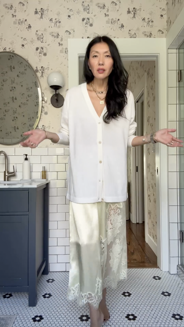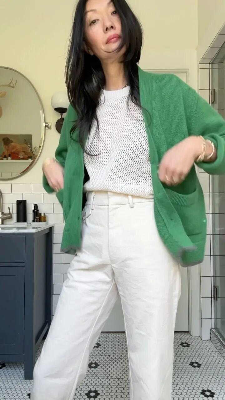 这组搭配更强调H廓形:直筒穿搭提高露肤度更容易好看,她一定会卷袖子露出手臂,同时选V领开衫制造纵向线条。
