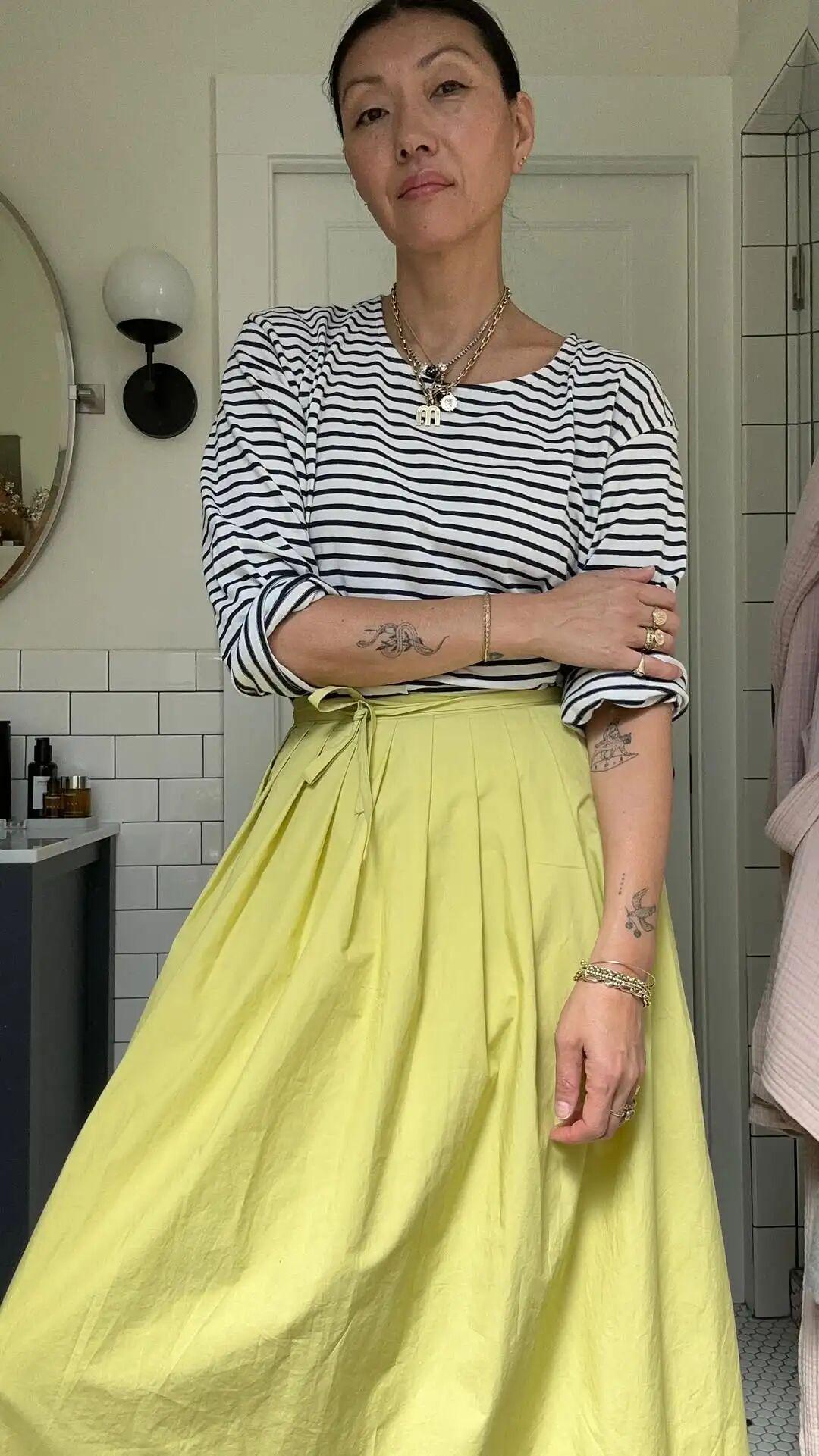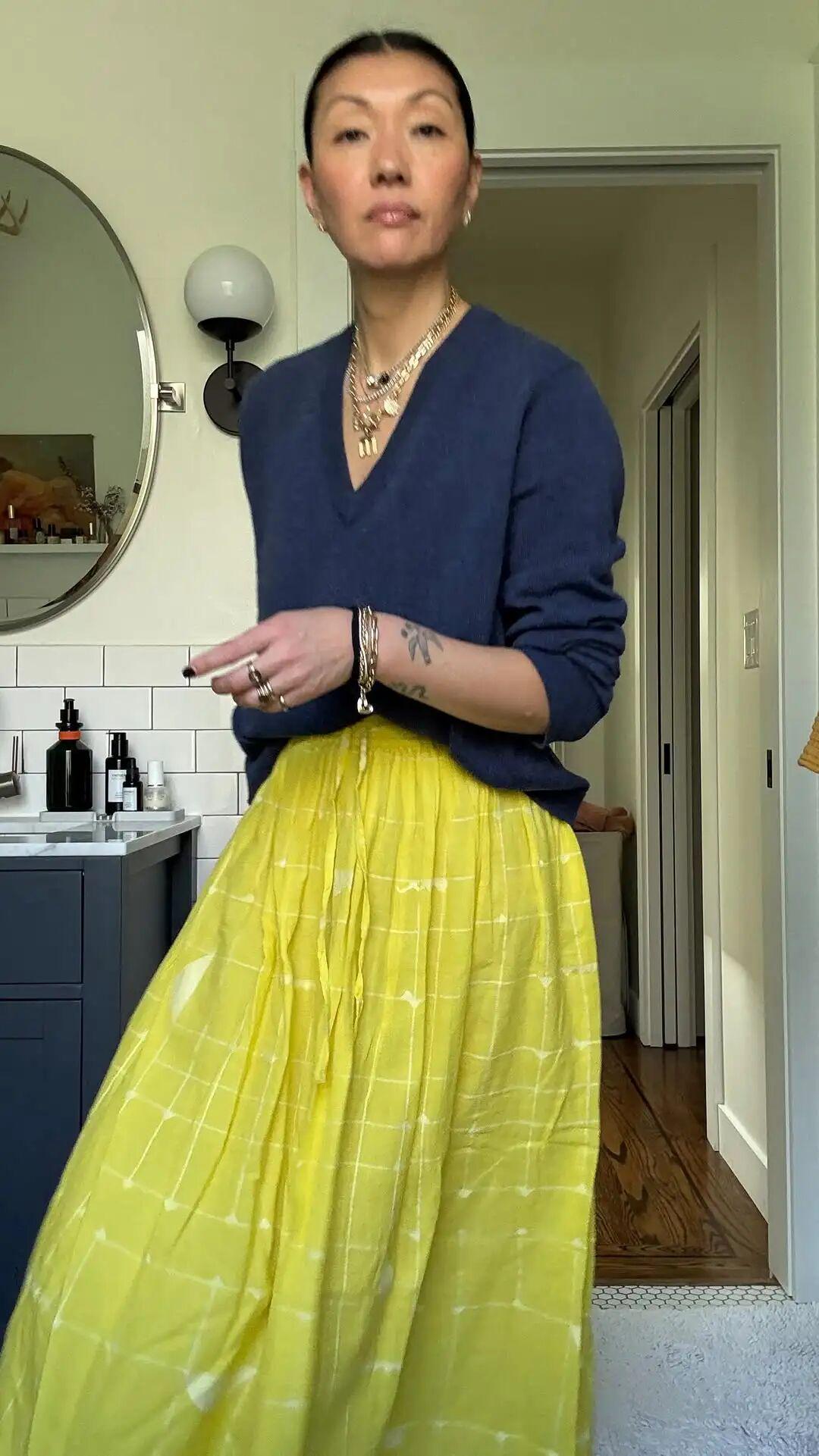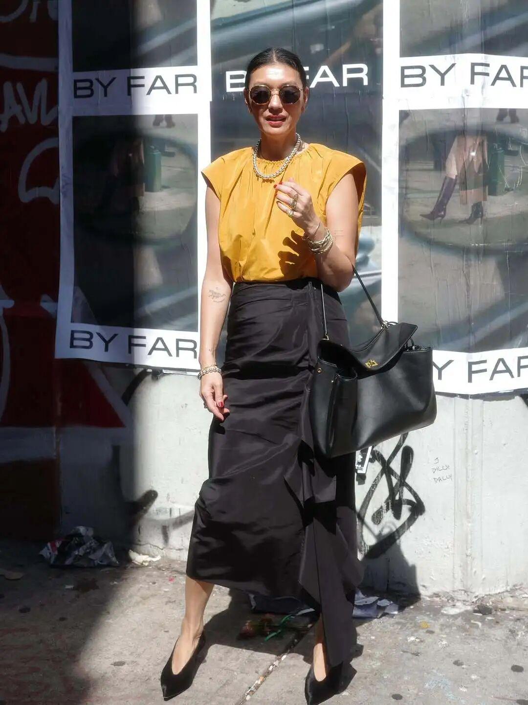 她很擅长叫醒一些看起来没那么实用的裙子,比如这种彩色半裙,可能大部分人第一反应都是搭配黑白灰等基础色上衣。