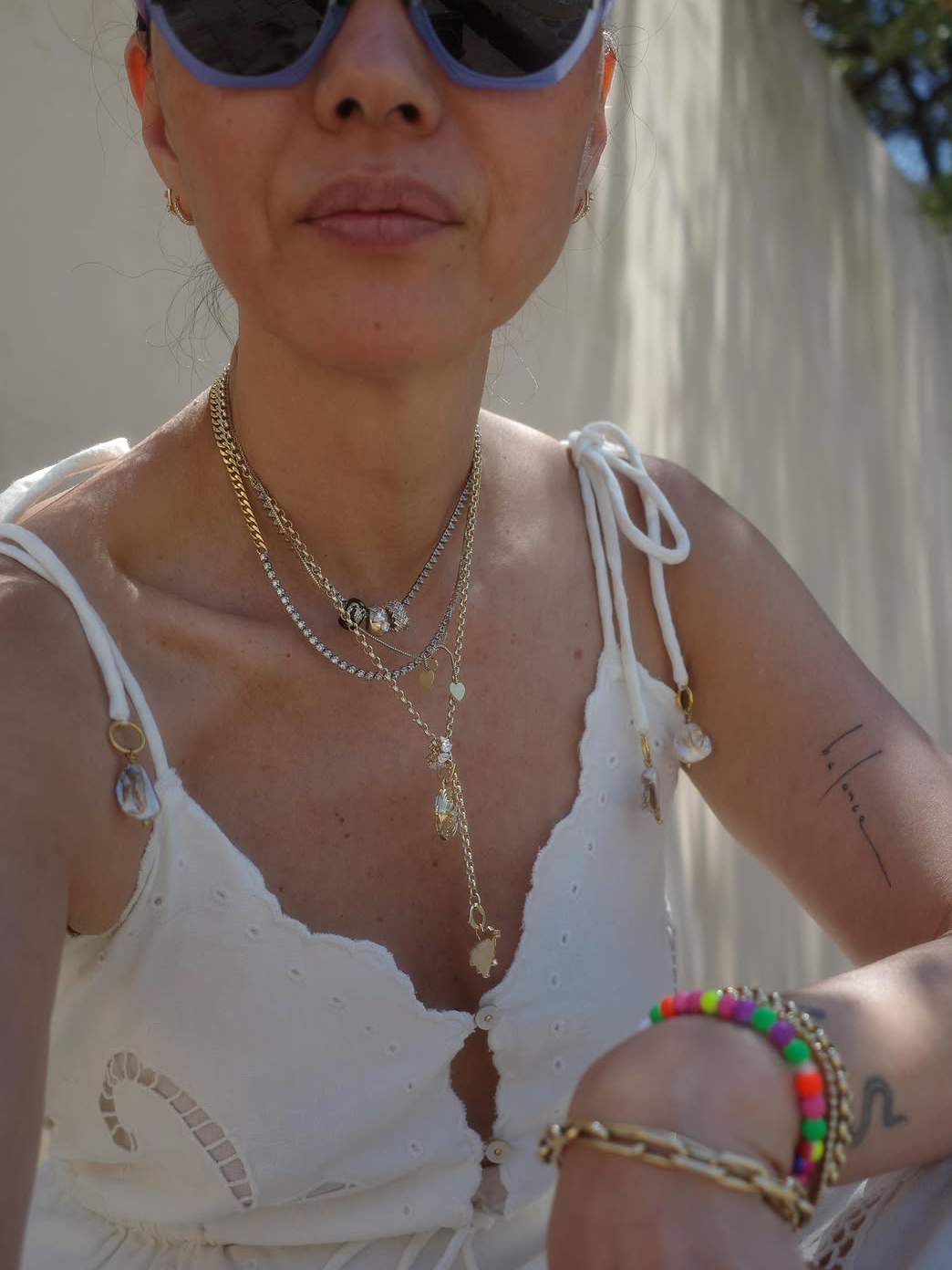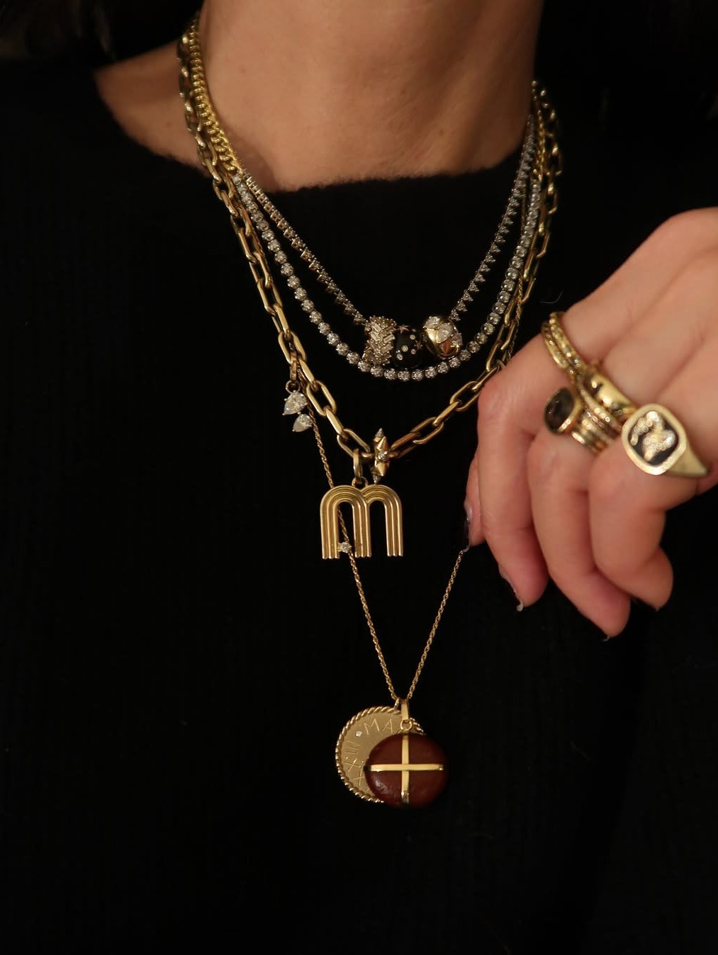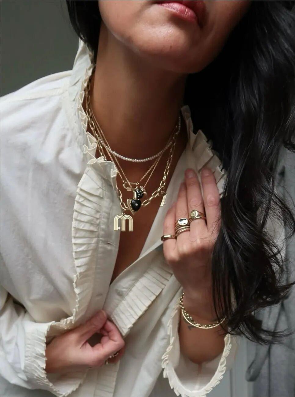 如果要数出场率最高的,就是这条“M字母吊带项链”,Meredith 几乎90%的搭配都有它的身影,来自品牌Adina Reyter。
