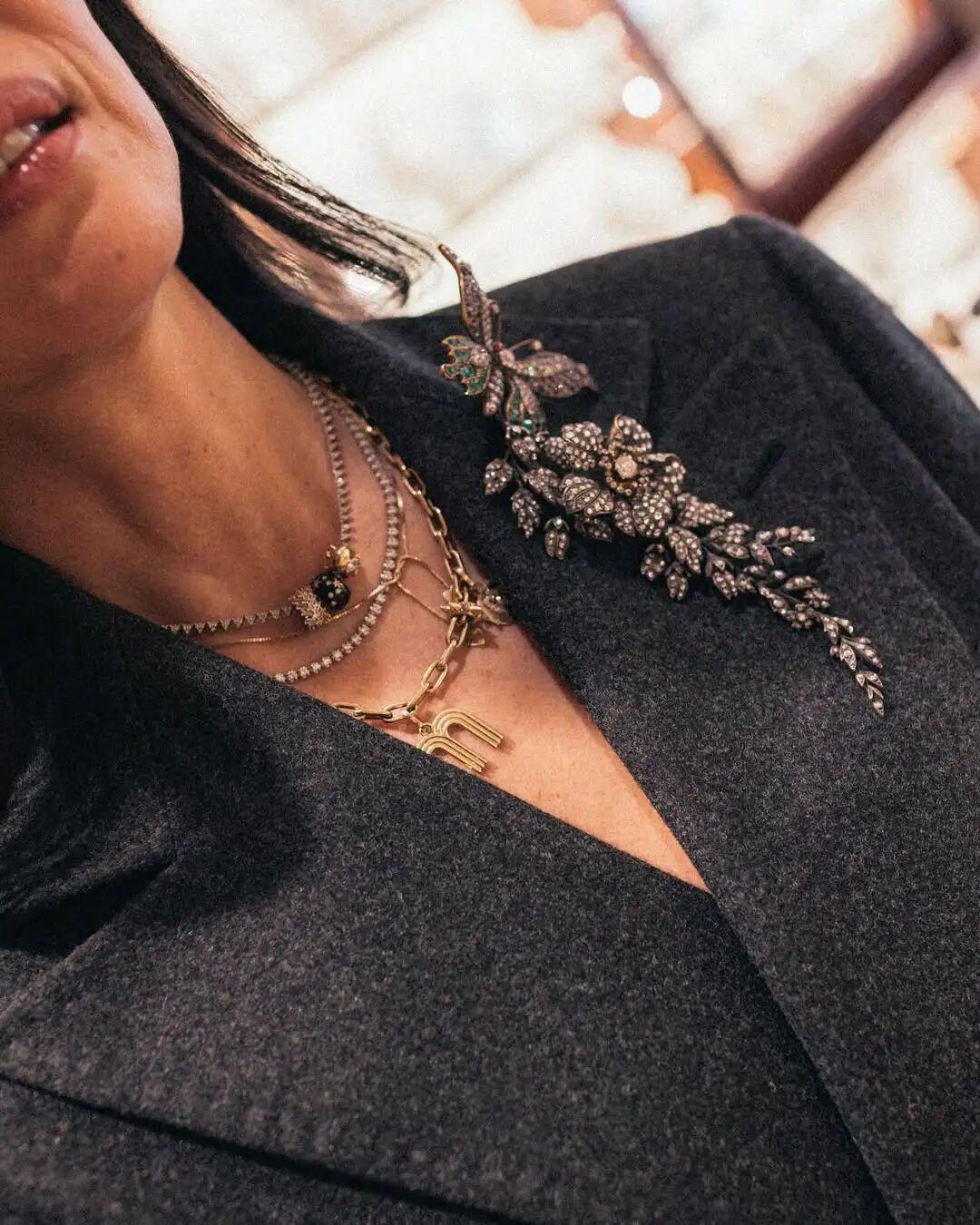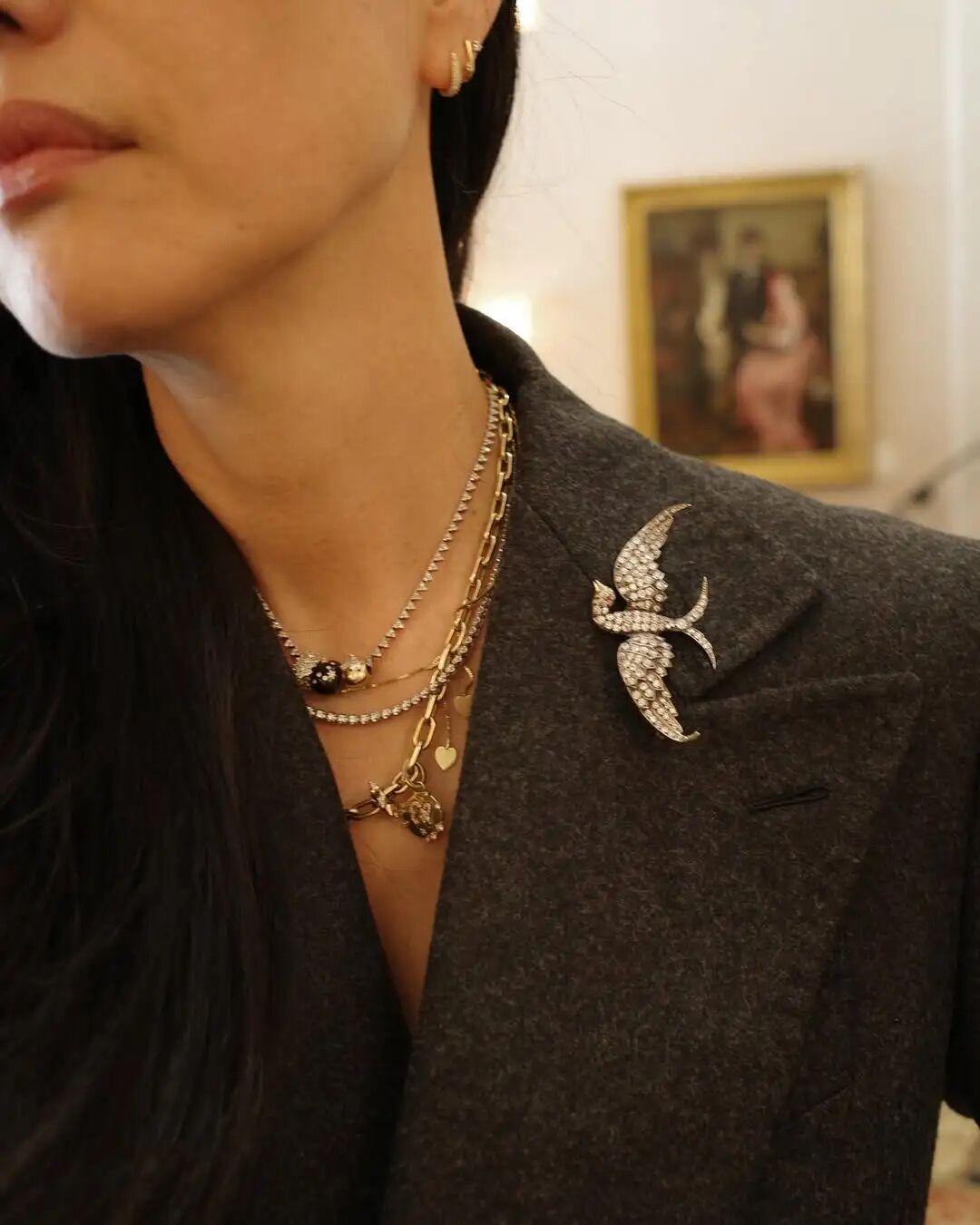 对于Meredith来说,M字母吊带项链就是她的重点,但她的叠戴方式更有存在感,她会选择不同长度、粗细的吊坠项链叠出层次。▼