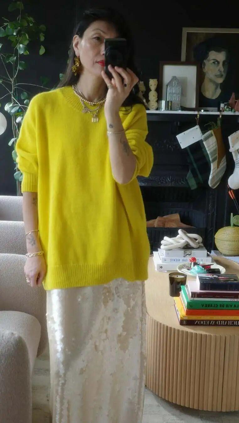 家里有彩色条纹衫的朋友,也可以试试她大胆撞色的思路。上衣都来自意大利牌子cashmerefolie。▼
