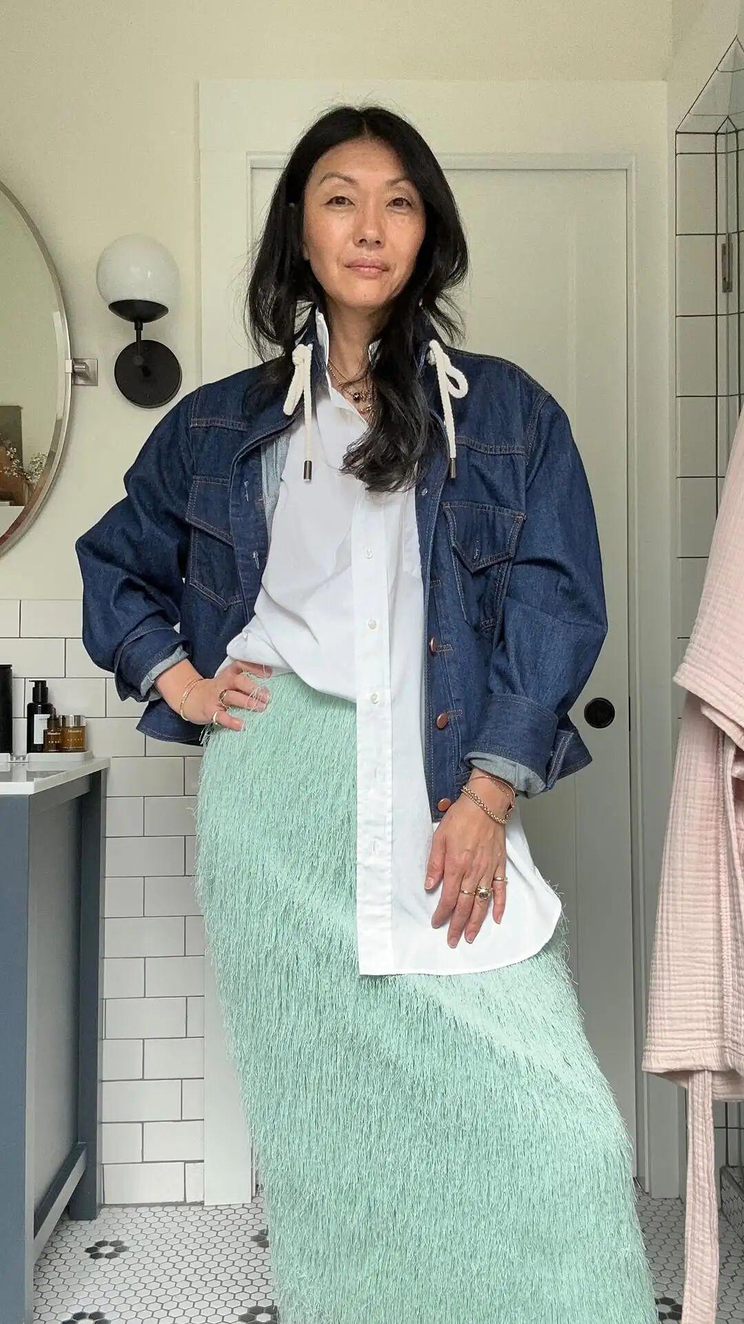 牛仔外套+印花半裙,也是同样的思路。 ▼