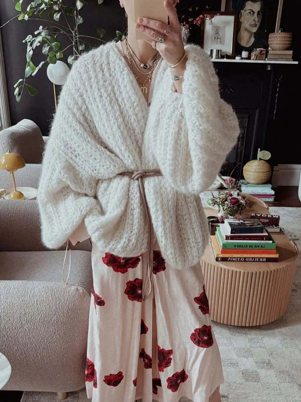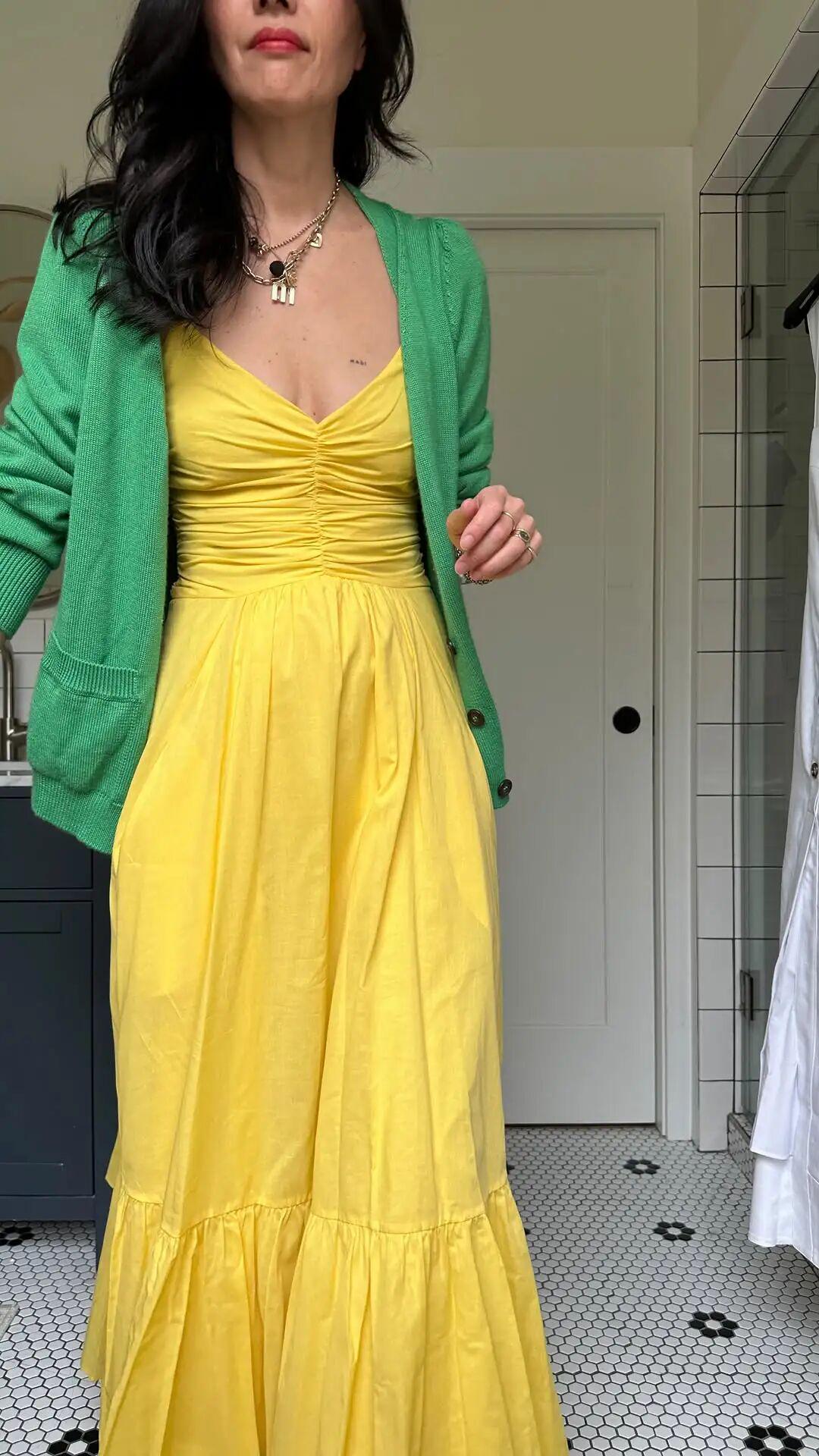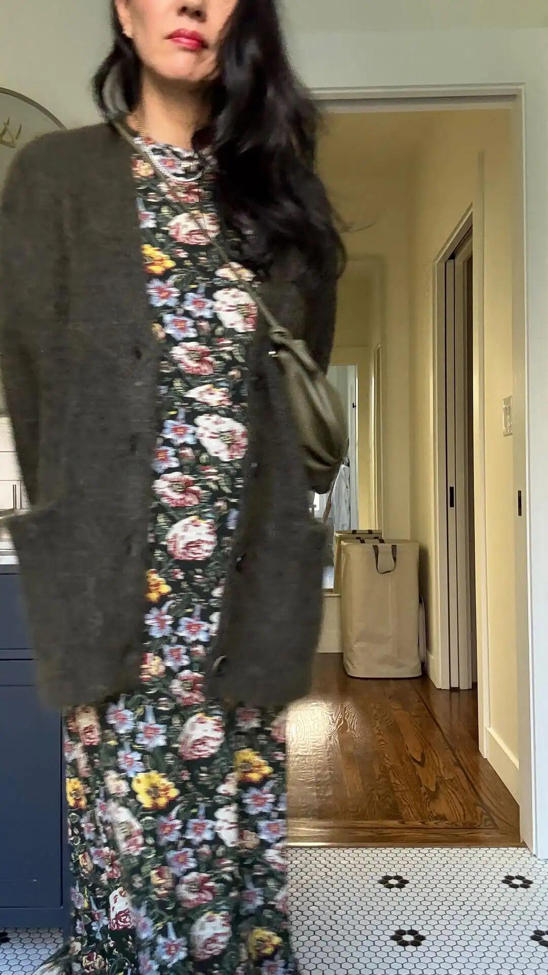 纯色针织开衫+印花连衣裙,绿色都和裙子的印花有呼应。▼