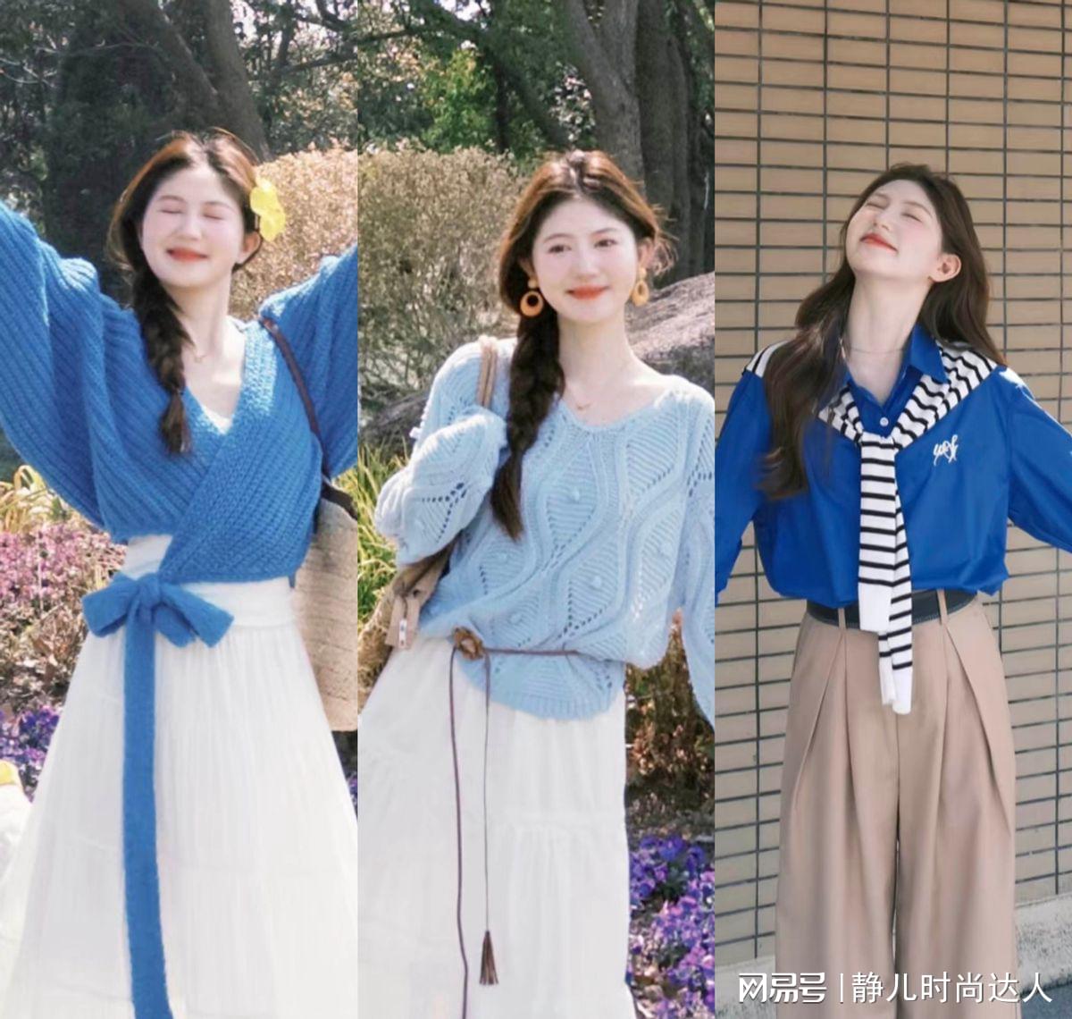 不管蓝色是深是浅,搭配白色裙子或者是宽松一点的白色裤装,呈现出来的画面都是无比清爽的,透露出来的也是很清新的美。
